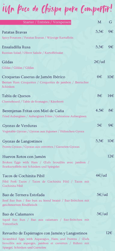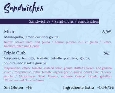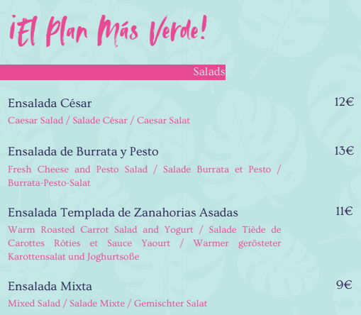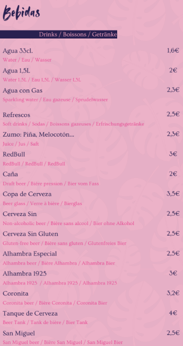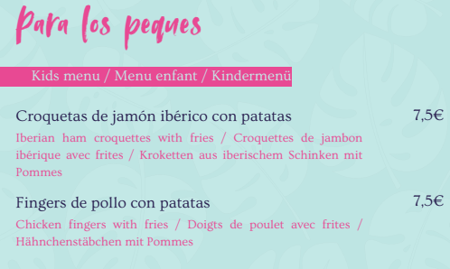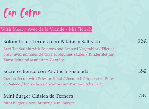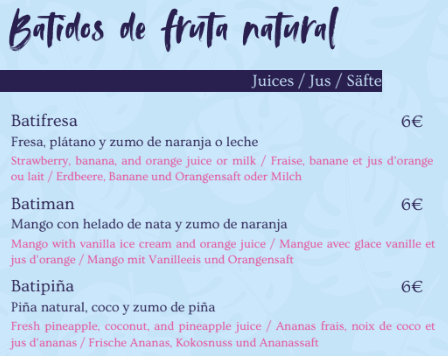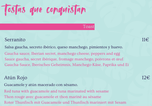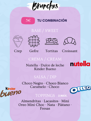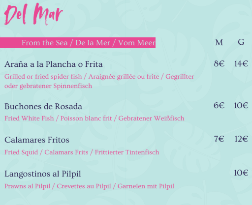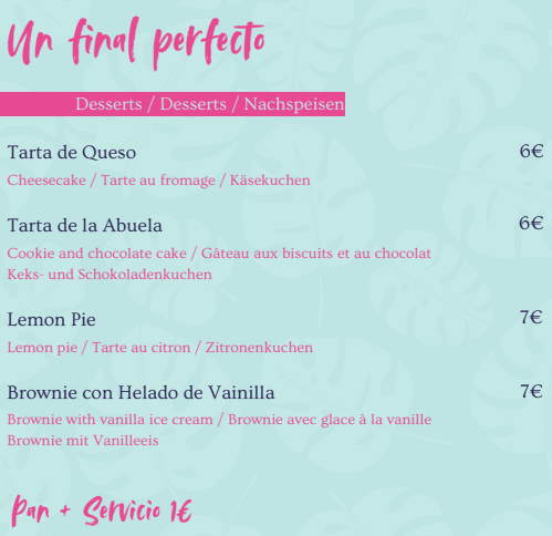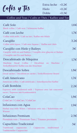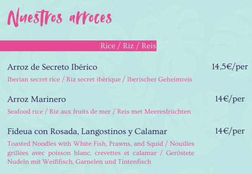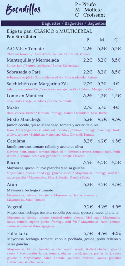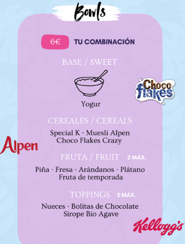 COMIDA DESAYUNO LLAMAR Menú Desayunos Bebidas Algo más fuerte Cafés, Tés y Smoothies Sandwiches Bocadillos Batidos de Fruta Natural Brunches Combos Menú Comidas Para los peques Del Mar Arroces Carnes Tostas Ensaladas Para compartir Postres